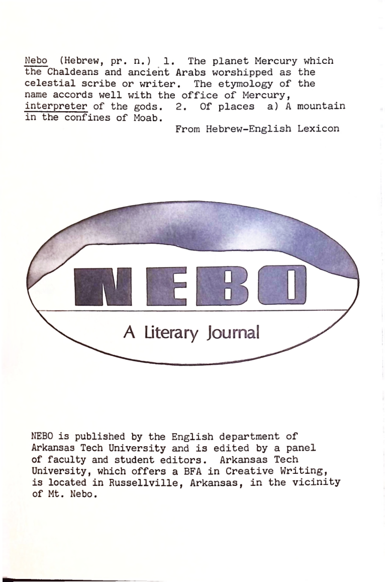 The inaugural issue of Nebo: A Literary Journal was published in the Spring of 1983. Although a "Letter from the Editor" section was not included in the issue, readers were offered a glimpse of the reasoning behind the journal's name on the inside cover.